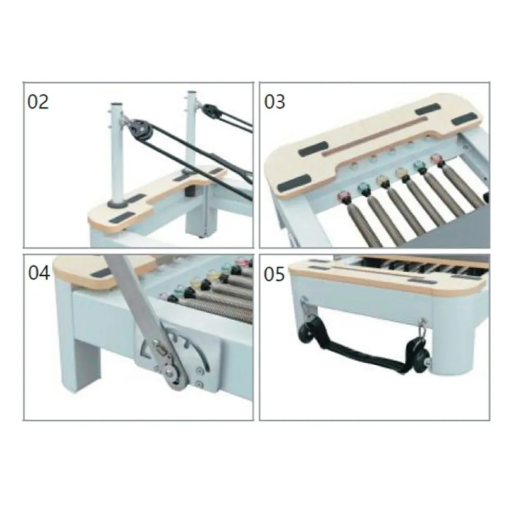 Foldbar og kompakt – fylder kun 0,3 m² ved opbevaring Justérbar fodpedal og 6 fjedre – fleksibel og effektiv træning Grå/hvid finish i PU-læder og alu – elegant og slidstærk Glidende sailboat-pulleys og hjul gør det nemt at flytte reformeren, når den ikke er i brug – uden at gå på kompromis med stabiliteten.