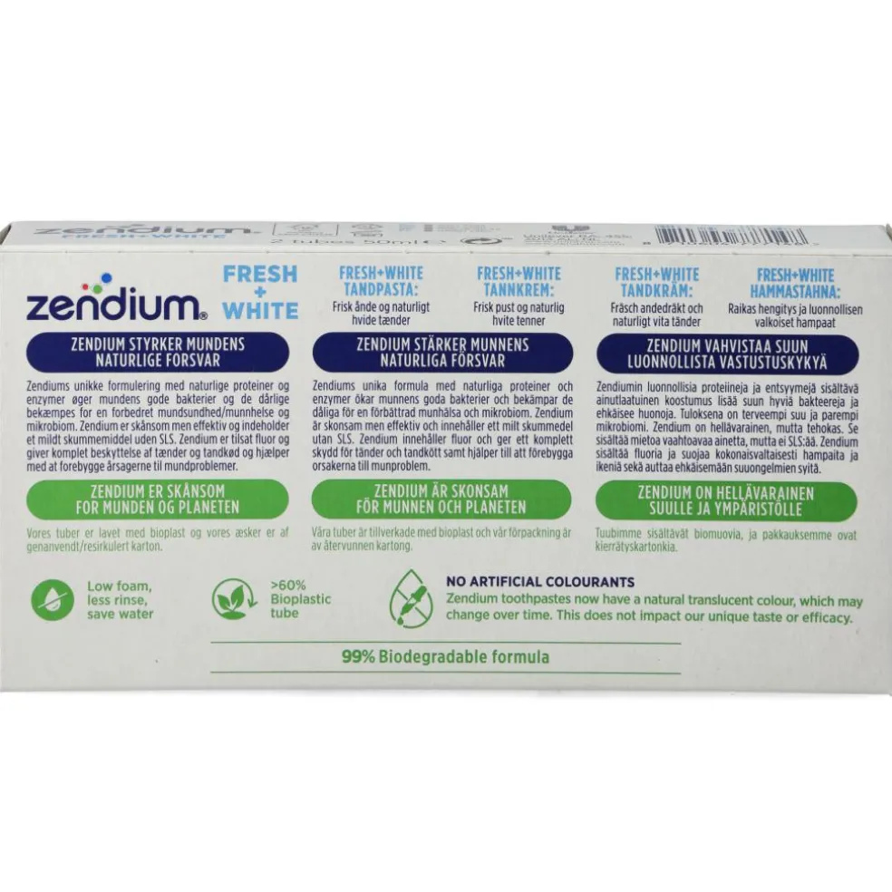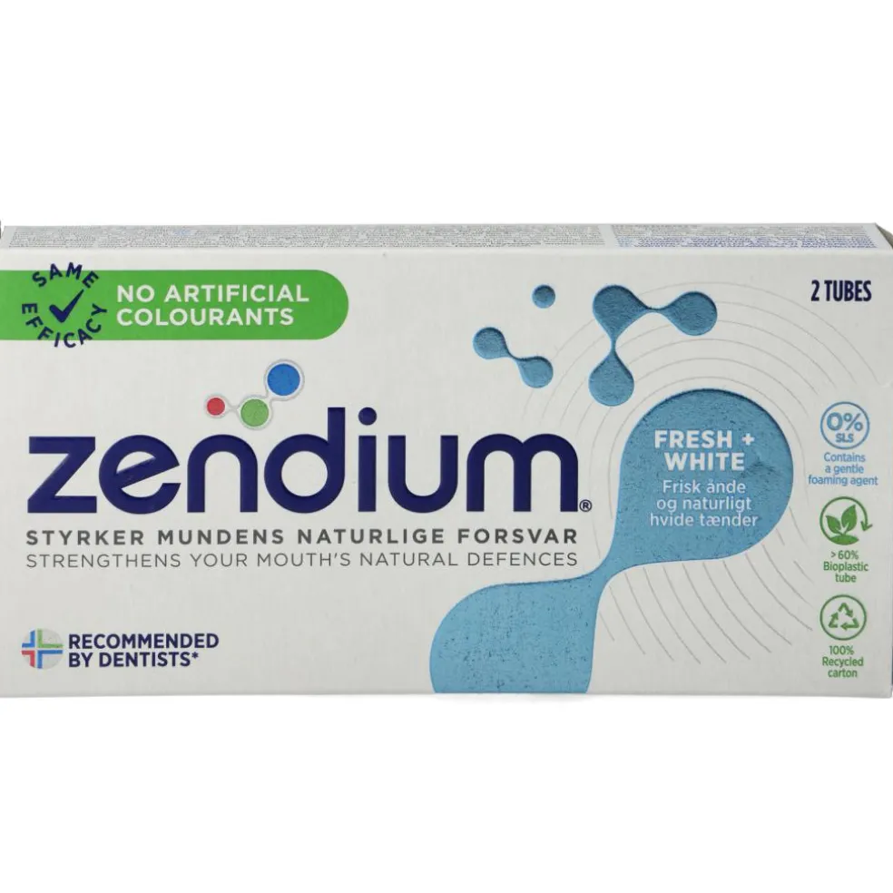 Zendium Fresh+White er en ekstra mild tandpasta, som effektivt beskytter mod plak og modvirker huller i tænderne. Zendium Fresh+White har et ekstra mild slibemiddel, der skånsomt polerer dine tænder og genskaber tændernes hvide farve. Den indeholder desuden zink, der hæmmer dårligt lugtende bakterier og giver frisk ånde.
