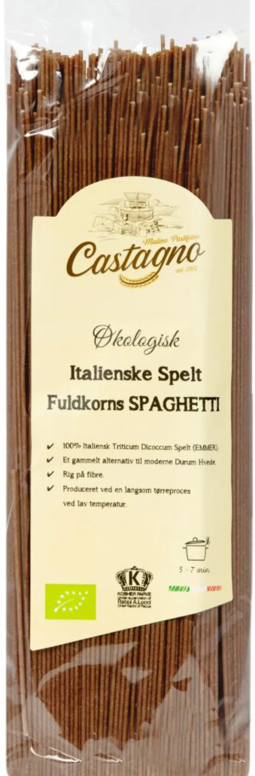 Alt Castagno’s spelt er fra økologisk landbrug og er 100% af italiensk oprindelse. Castagno maler selv deres spelt på en unik måde for at få en 100% fuldkornsmel, derefter tilberedes det ved hjælp af en langsom tørringsproces ved lav temperatur, som gør det muligt at opretholde det meste af kornets egenskaber.