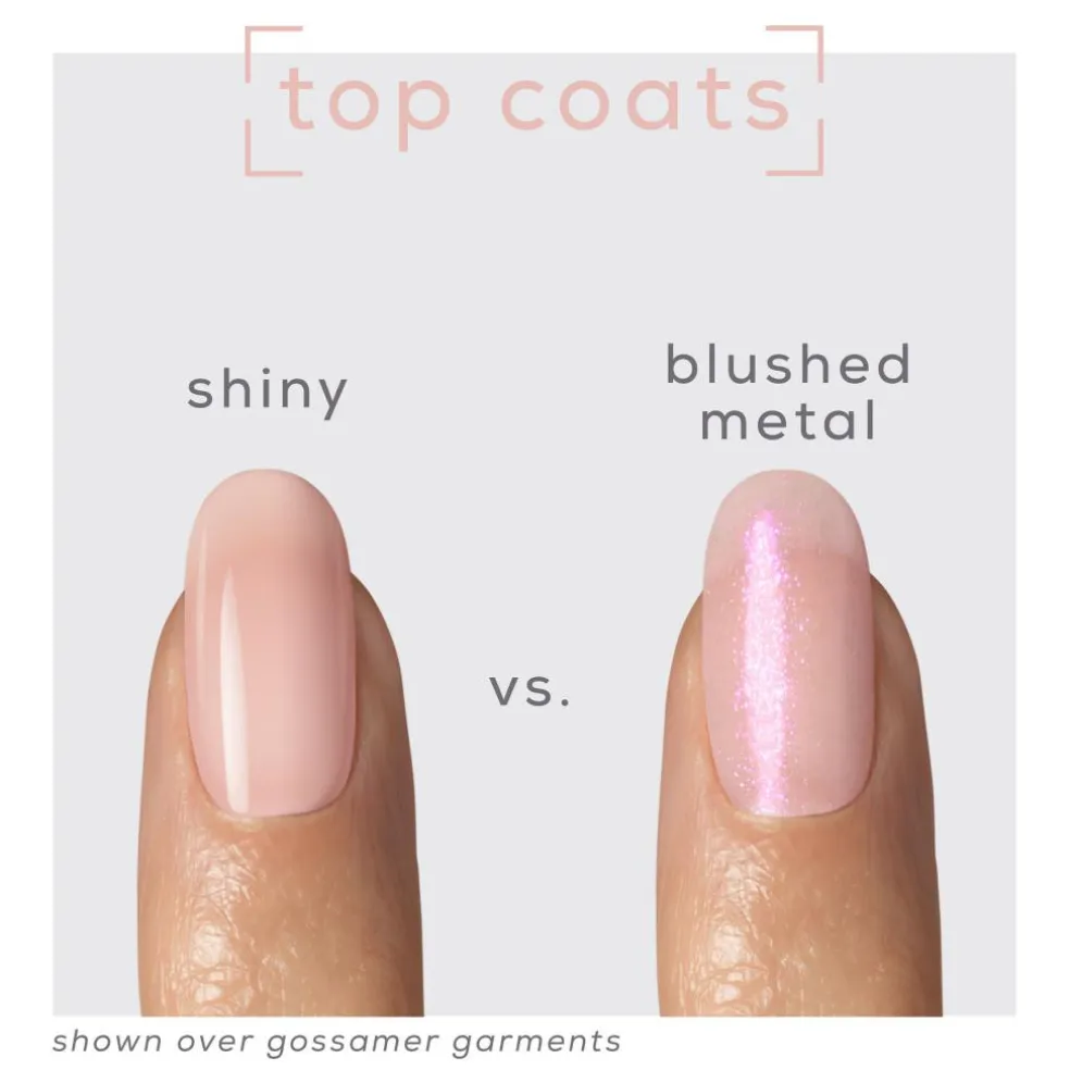 Trin 2. Påfør 1 lag gel couture by essie emetallic glaze overlak for en glimtende, iriserende eller silkeblank glans. UV-lampe ikke nødvendig. Påfør ny overlak på dag 7.