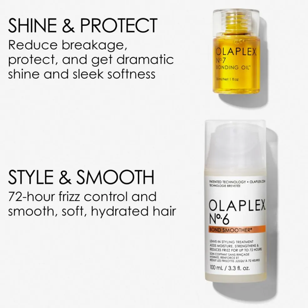 En udglattende og glansforbedrende stylingduo, der består af Olaplex bestsellers – nr. 6 Bond Smoother® og nr. 7 Bonding Oil™, der arbejder sammen om at bekæmpe krus og tegn på skader, i alle hårtyper.