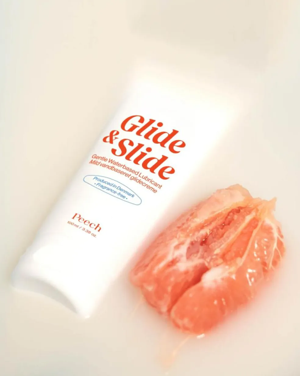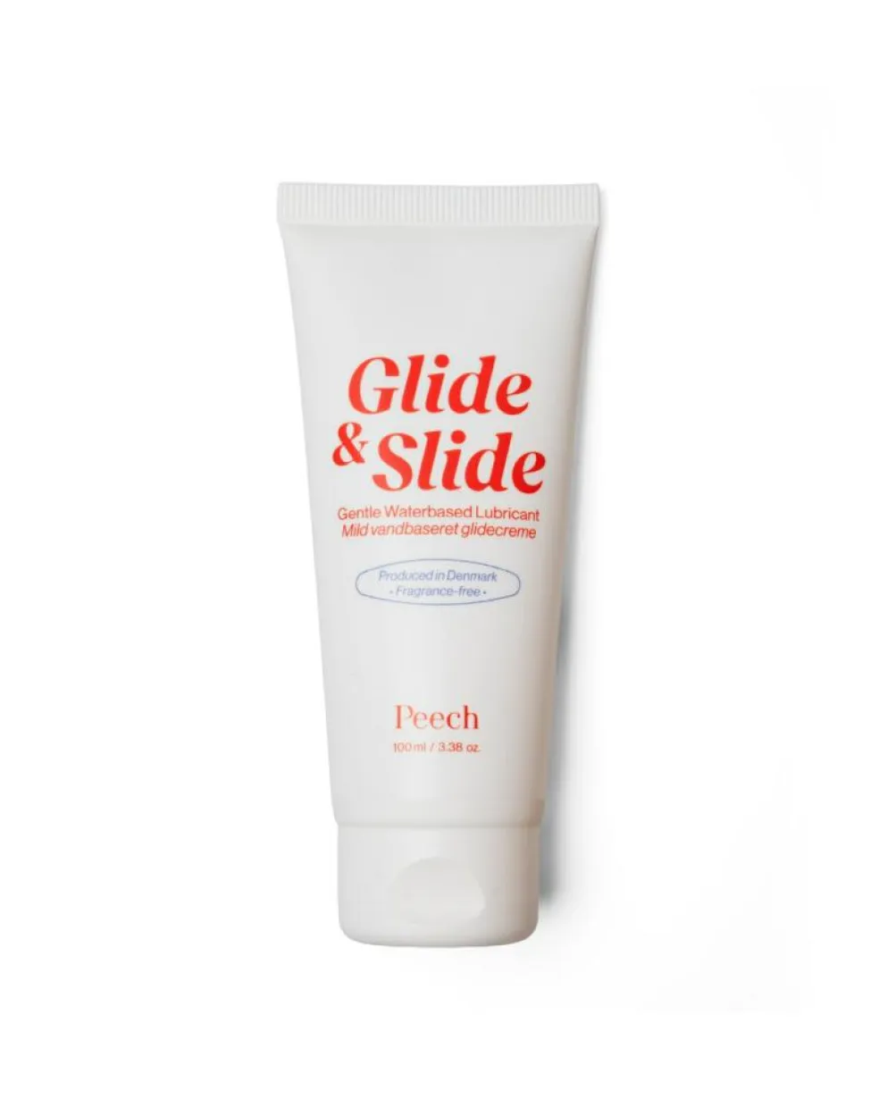 Glide & Slide er Peechs første vandbaserede glidecreme, som er danskproduceret, vegansk og parfumefri.