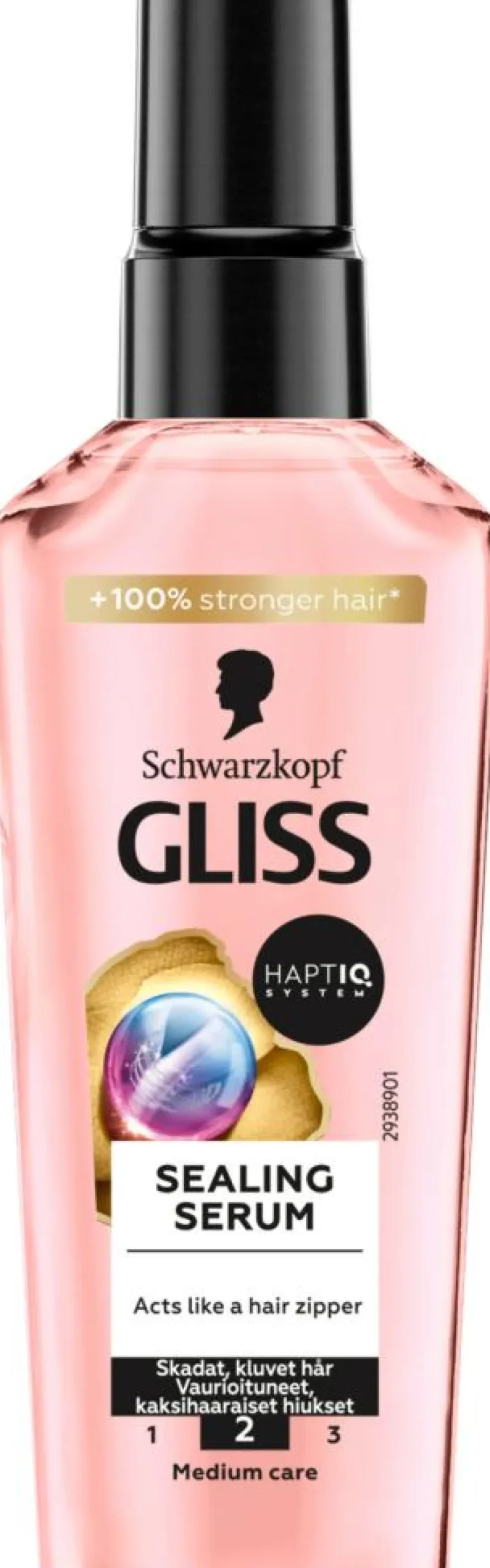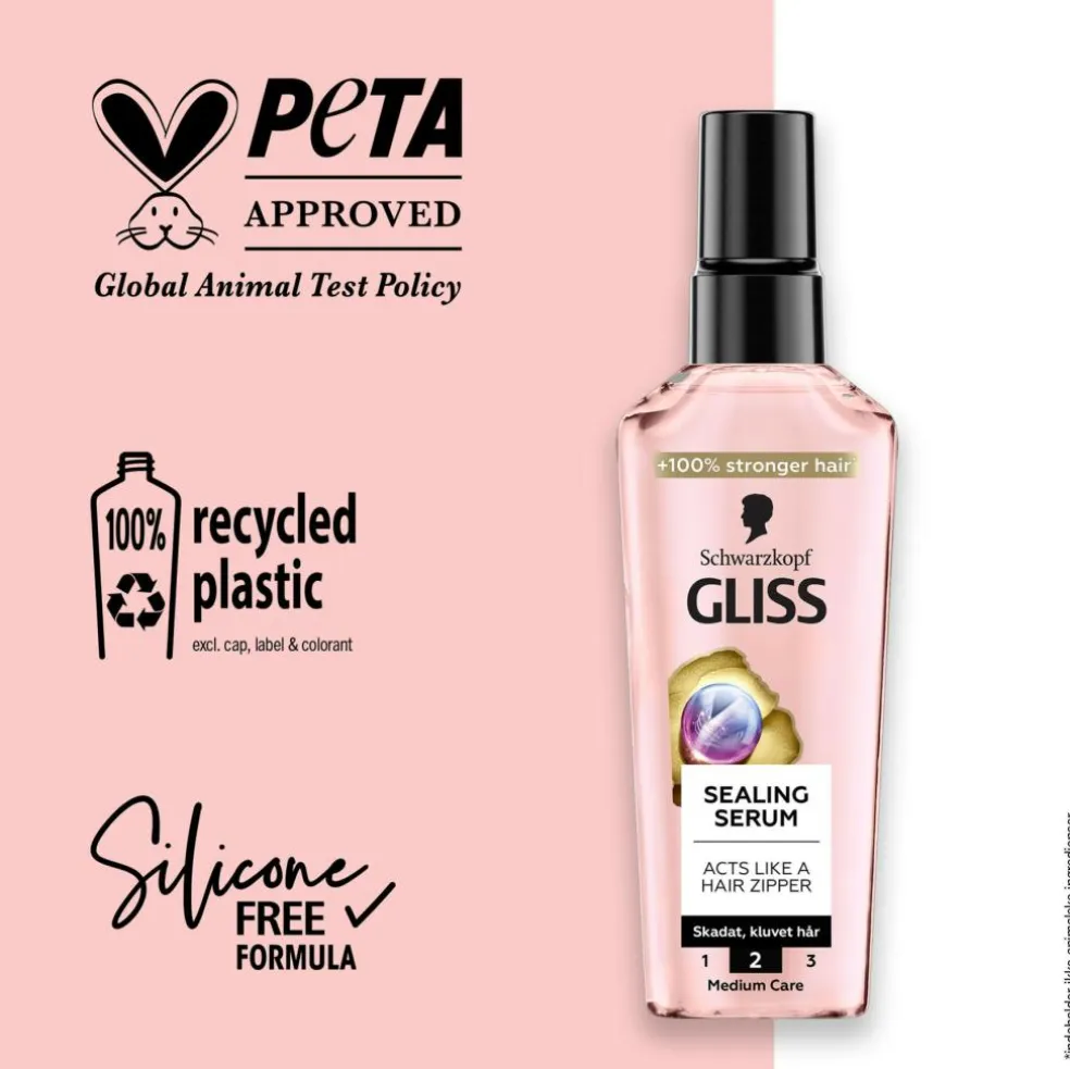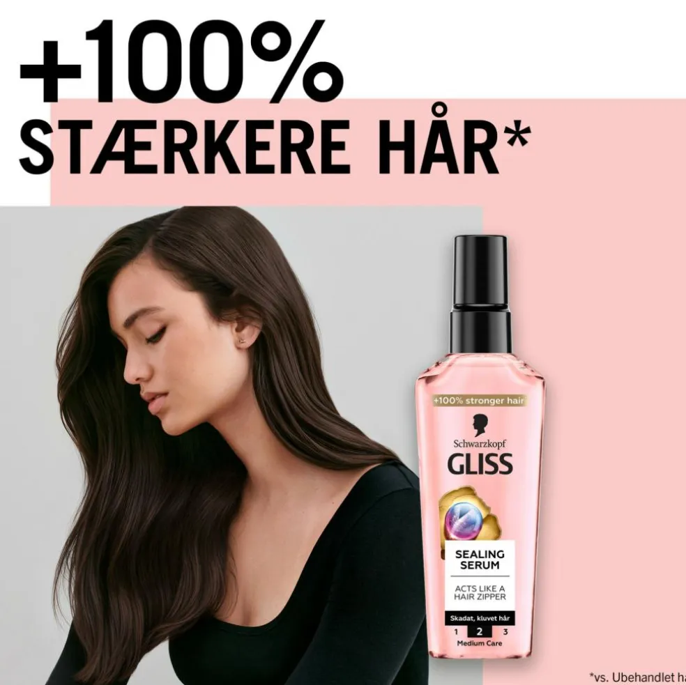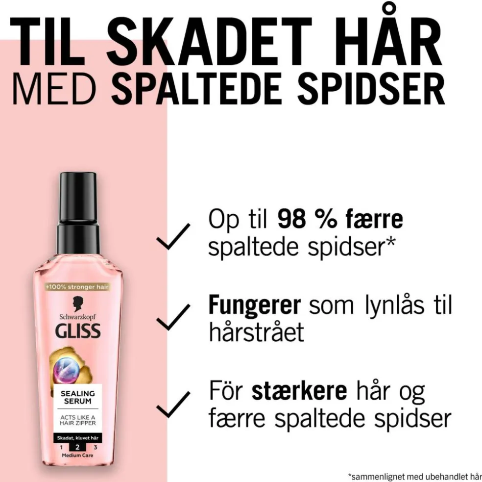 Gliss Care Level: 2 – Medium pleje, med en velafbalanceret sammensætning af nærende ingredienser. Dette Gliss hårserum fungerer som en lynlås med langvarig forsegling for op til 98 % færre spaltede spidser*. Med en beskyttende moskusagtig duft.
