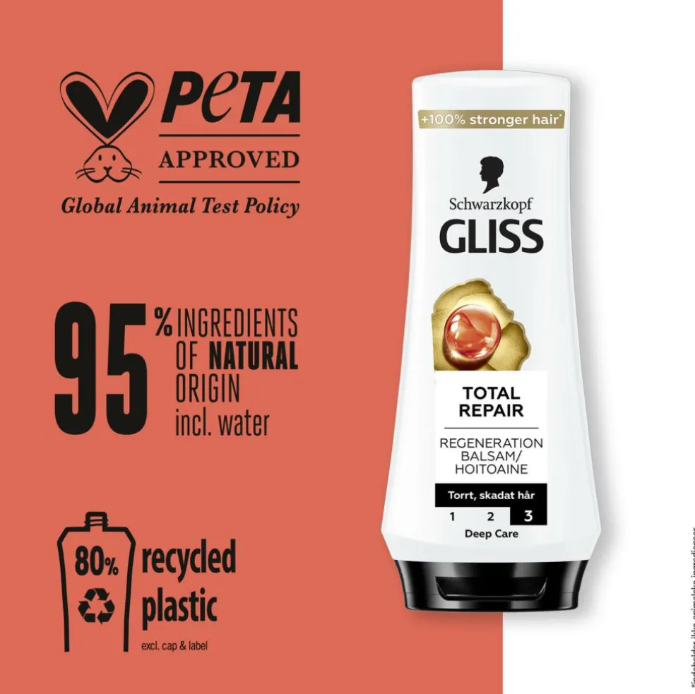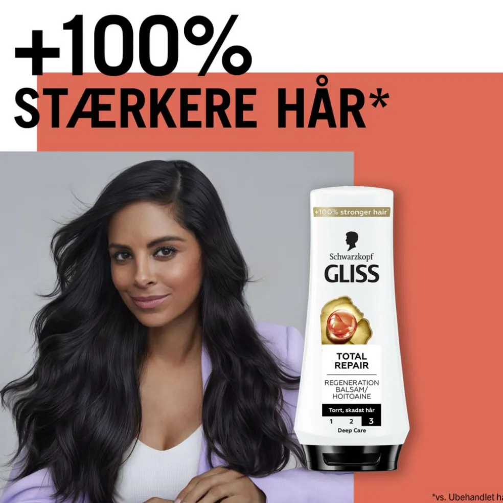 Denne Gliss balsam genopbygger håret i dybden og reducerer hårbrud***. Den behandler håret, så det er lige til at rede ud. Denne genoprettende balsam glatter og blødgør håret og efterlader det smidigt, sundt og skinnende. Med en beskyttende moskusagtig duft. 95 % af ingredienserne er af naturlig oprindelse.*