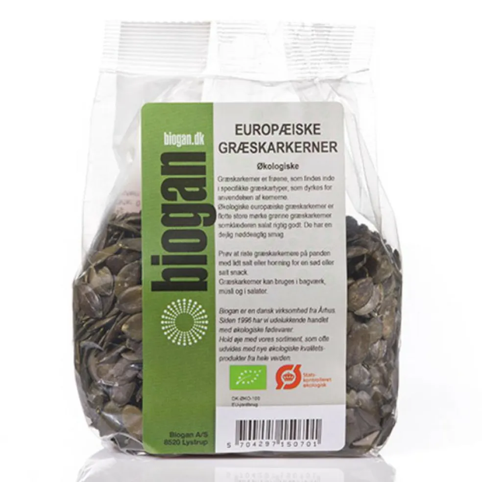 Økologiske græskarkerner, som er flotte mørke grønne græskarkerner der “klæder” en salat rigtig godt.