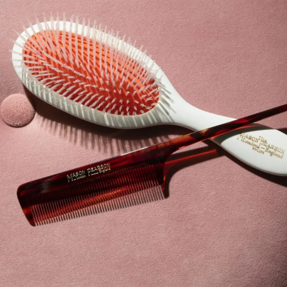 Denne luksuriøse hårbørste er håndlavet med stærke nylonbørstehår, der fungerer som en effektiv detangler, der skånsomt løsner og udreder sammenfiltringer i håret. Hovedbunden stimuleres med en blid masserende effekt, samtidig med at både hår og hovedbund beskyttes under udredning. Den ikoniske orange Mason Pearson gummipude former sig efter hovedbunden og sikrer en fleksibel, behagelig og stressfri børsteoplevelse.