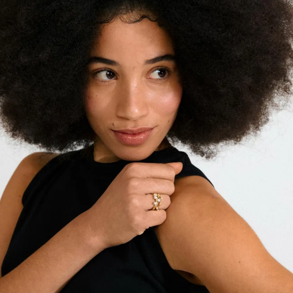 De guldbelagte HADLEY ringe fra Pilgrim kommer i et sødt og organisk design, hvor små bobler og perlemorsfarvede glasperler fanger essensen af dugdråber i den tidlige morgen.