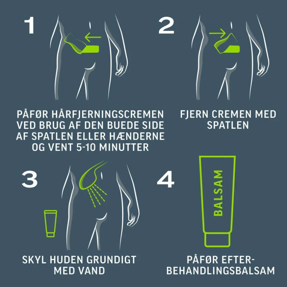 Brug først hårfjerningscremen, der depilerer selv de mest følsomme, intime kropsområder.