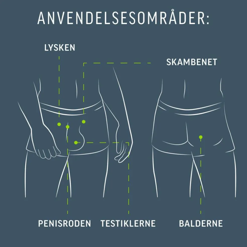 Produktet er egnet til brug i lysken, på skambenet, bunden af penis, pungen og balderne.