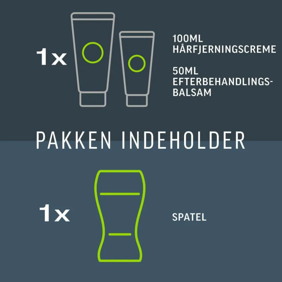 En pakke Veet Men Hair Removal Kit indeholder 100ml sensitiv hårfjerningscreme, 50ml efterbehandlingsbalsam samt en spatel til at fjerne overskydende creme.