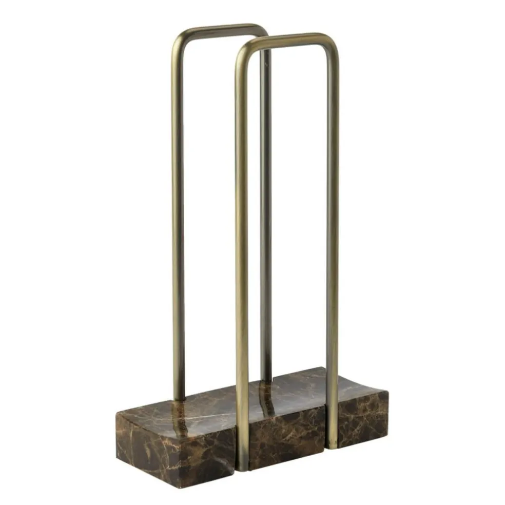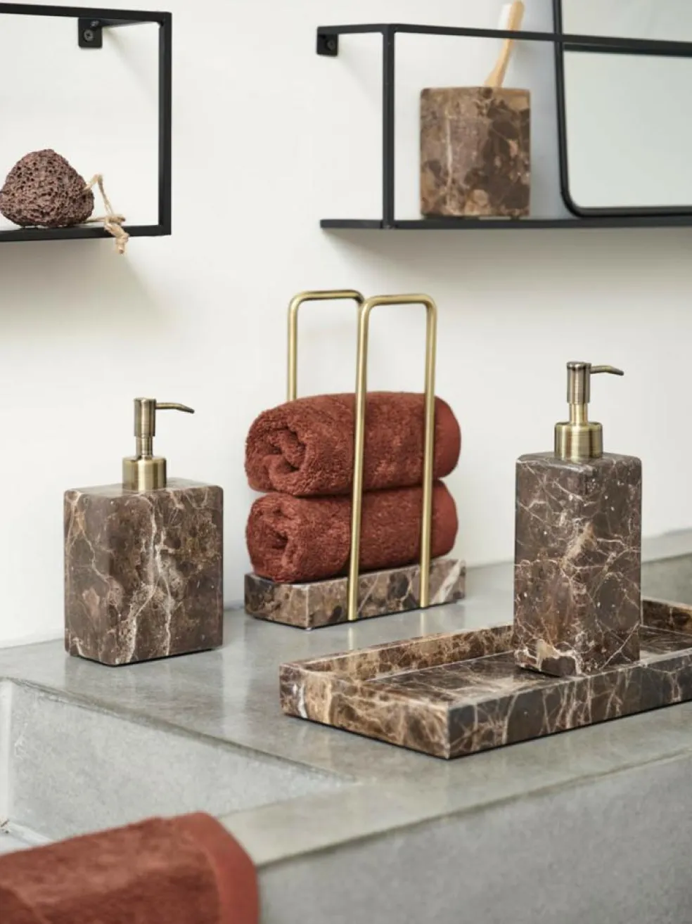 Bunden er lavet af brun marmor – et naturmateriale, der tilfører en eksklusiv varme og naturlig charme til rummet. Fra marmorbunden rejser to slanke stænger i rustfrit stål sig, og her kan dine gæstehåndklæder foldes og opbevares på smukkeste vis. Resultatet er et badeværelse, der ikke bare er praktisk, men også indbydende og gennemtænkt i sin æstetik.