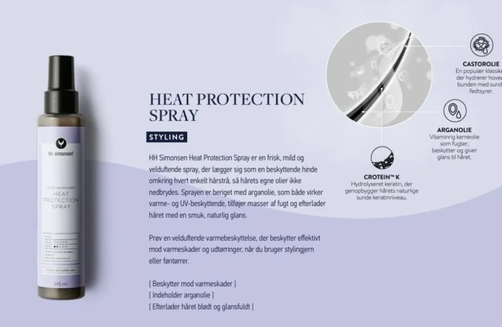 Beskyt dit hår mod skader med HH Simonsen Heat Protection Spray – en let og velduftende spray, der lægger sig som en usynlig beskyttende hinde omkring hvert hårstrå. Denne barriere forhindrer hårets naturlige olier i at nedbrydes og minimerer risikoen for varmeskader og udtørring ved brug af føntørrer eller stylingjern.