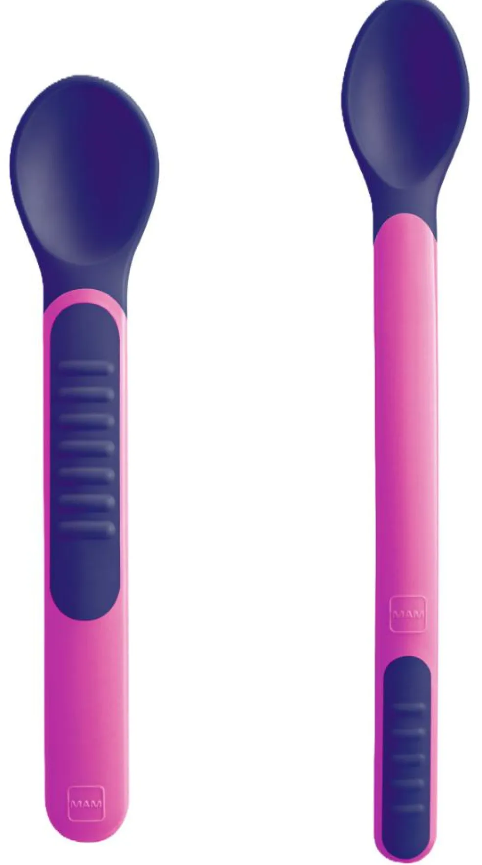 Skeblad, der skifter farve, hvis maden er for varm. Skeens lange skaft gør det nemt for forældrene at nå ned i glasset med babymad.