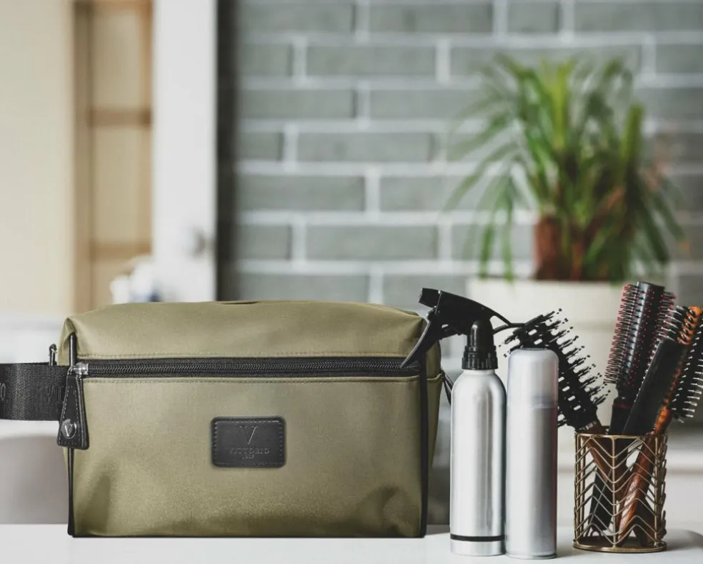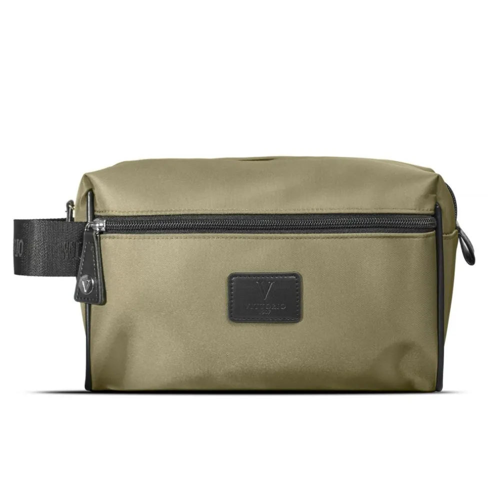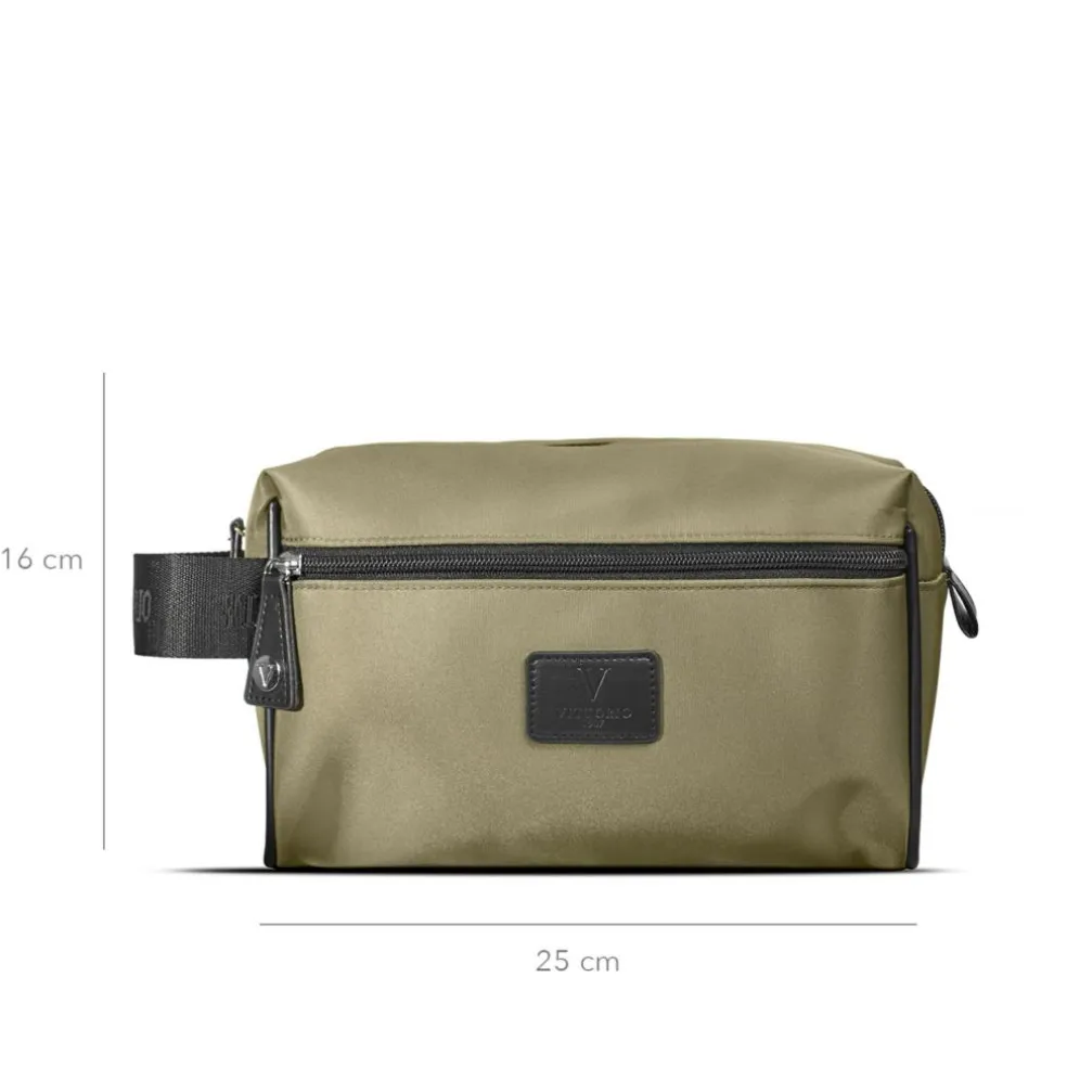 Vittorio bestseller toilettaske i grøn, er lavet i et tidsløst og moderne design, med små læder-lignende detaljer. Tasken indeholder to store opdelte rum, samt en udvendig lynlås-lomme.