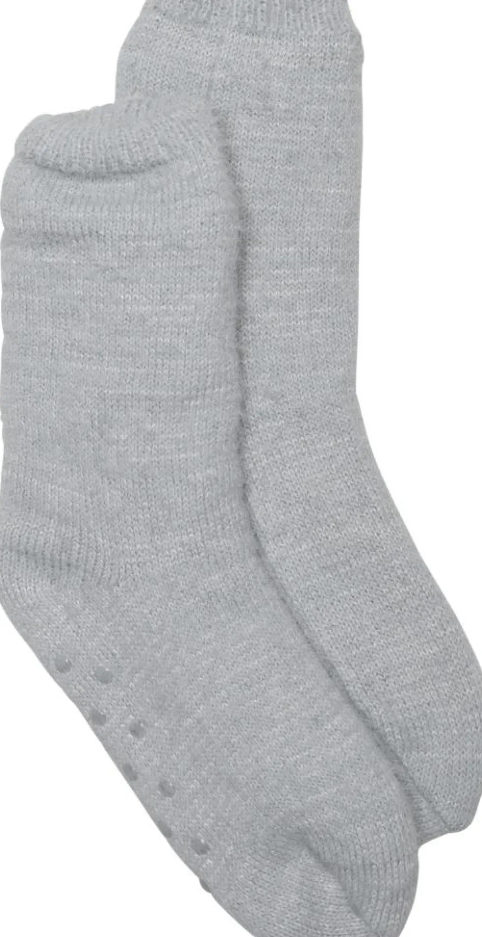 Bløde og varme hjemmesokker med foer i grå med skridsikre dutter. 70% Polyacryl, 30% Polyamid