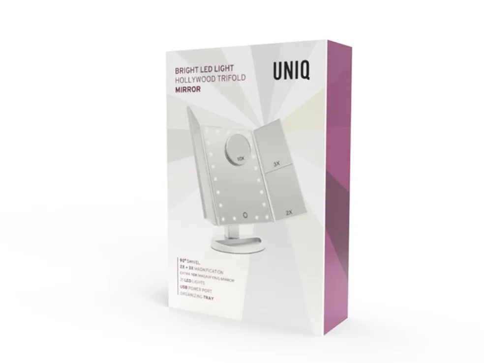 Skab den perfekte makeup hver gang med UNIQ Hollywood Makeup Trifold Spejl med Lys. Et must-have for enhver makeup-entusiast.
