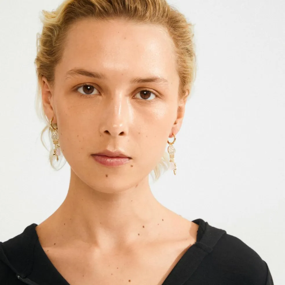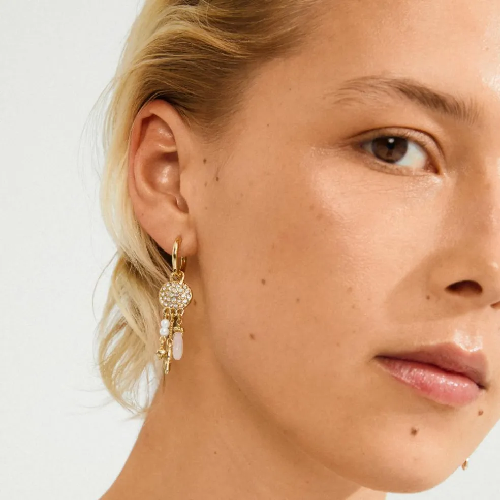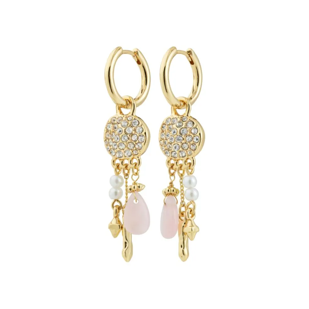 De guldbelagte SHIFT hoops fra Pilgrims Moments of Change-kollektion er den ultimative kombi af boho chic og whimsical elegance. Små coin-vedhæng, dekoreret med glitrende Preciosa-krystaller, reflekterer lyset magisk, mens perlemorsfarvede glasperler og kærlighedsstenen Rosenkvarts tilfører et breezy, free-spirited feel.
