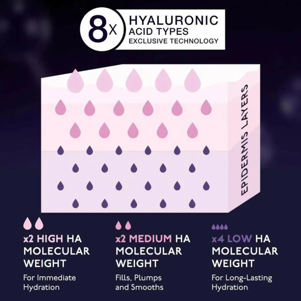 - Med sine 8 forskellige typer hyaluronsyre i 3 molekylvægte (lav, medium og høj) hjælper denne hudplejeberigende formel med at beskytte og forhindre dehydrering af huden