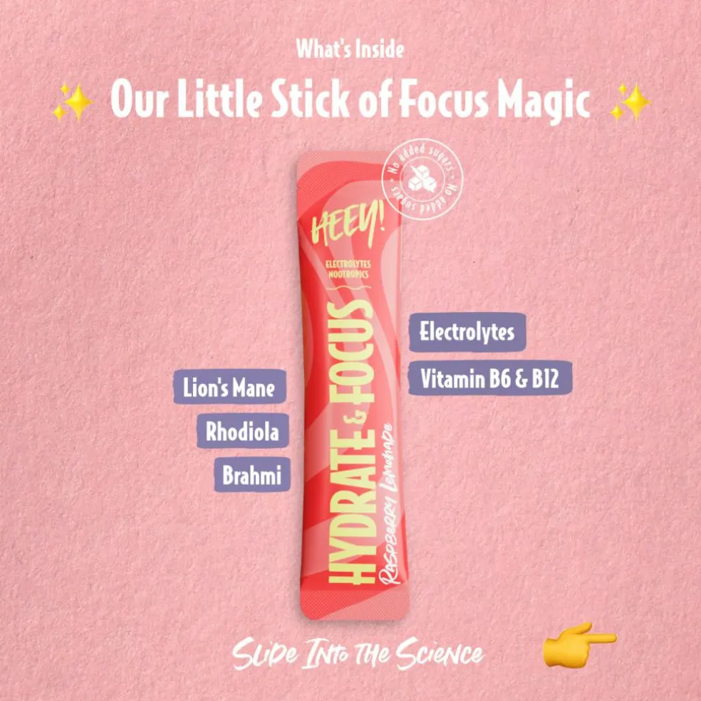 - Heey! Hydrate & Focus fås både som genlukkelig pose til daglig brug og som praktiske stick packs, klar til farten. Stick packs er perfekte til tasken, arbejdet, træningen eller rejsen – bare riv op, bland med koldt vand og drik. Ingen opmåling. Ingen spild.