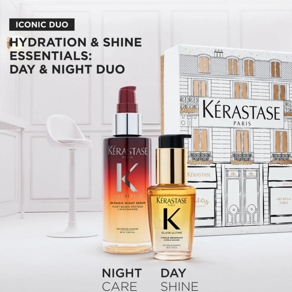 Dette Holiday Set indeholder to af dine Kérastase-favoritter Nutritive 8H Magic Night Serum Leave-In & Elixir Ultime L’Huile Originale Hair Oil.