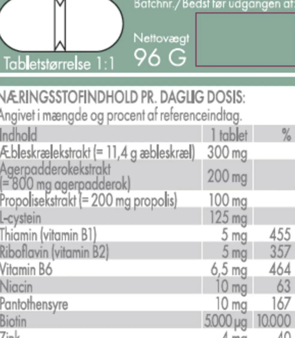 Næringsstofindhold pr. anbefalet daglig dosis (1 tablet) :