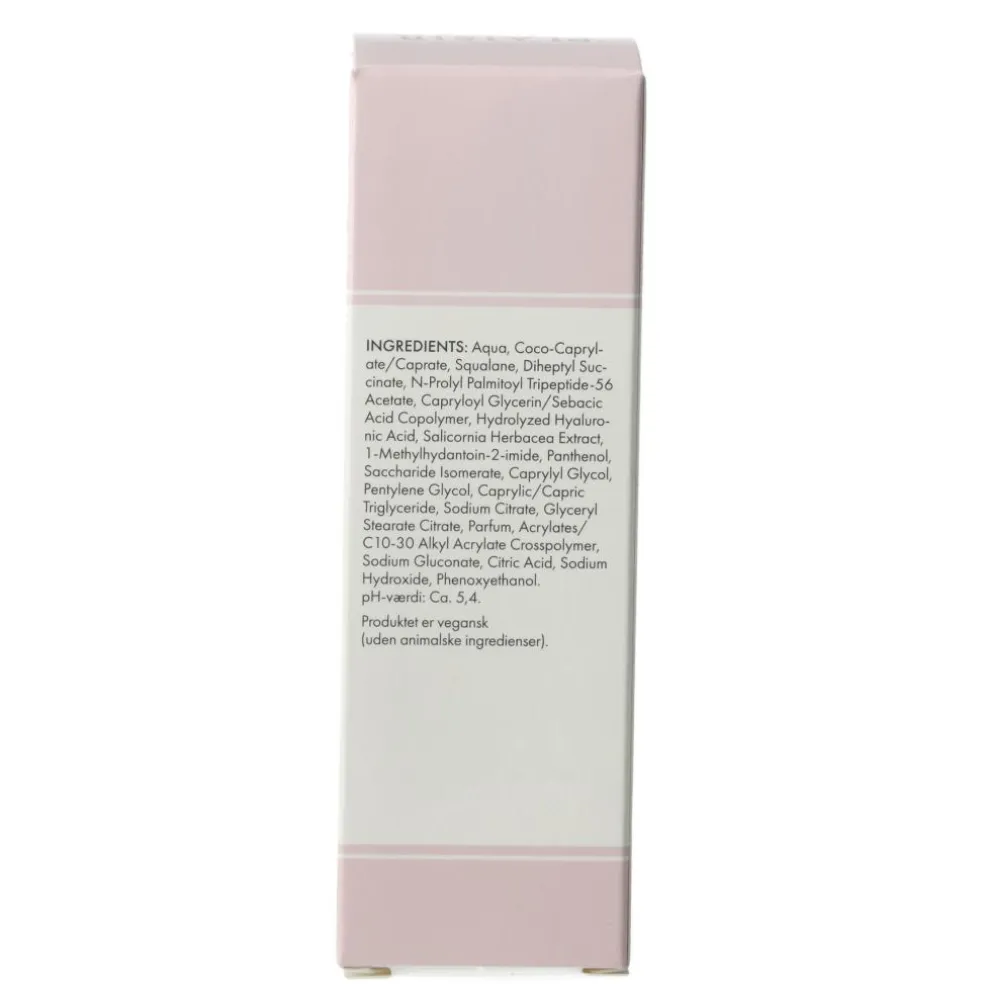 - Hydrolyseret hyaluronsyre tilfører fugt, reducerer synligheden af rynker, styrker hudens spændstighed og virker foryngende