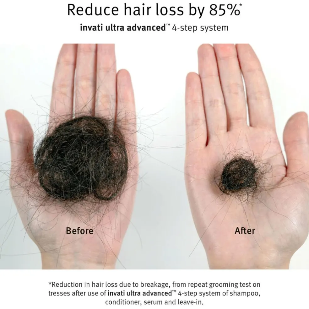 *Reduktion af hårtab på grund af brud, fra gentagne grooming-tests på hårstrå efter brug af Invati Ultra Advanced™ 4-trinssystem med shampoo, balsam, serum og leave-in.