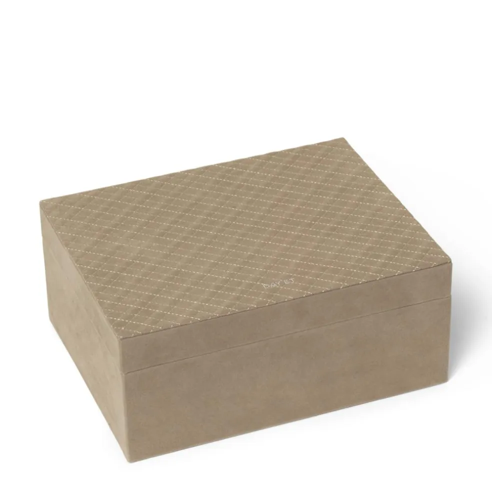 Det er designet i velour med quilt detaljer, og fortil har det Day Et logoet i sølv.