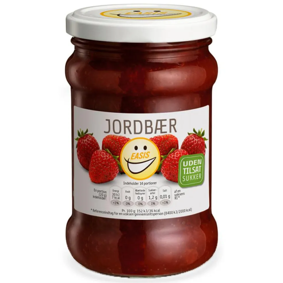 EASIS Jordbær Marmelade giver dig den gode, lækre smag af nyplukkede jordbær. Nyd den på brød, yoghurt eller til kager og desserter. Den indeholder hele 80% færre kalorier end traditionel marmelade, og så er den ikke tilsat sukker.