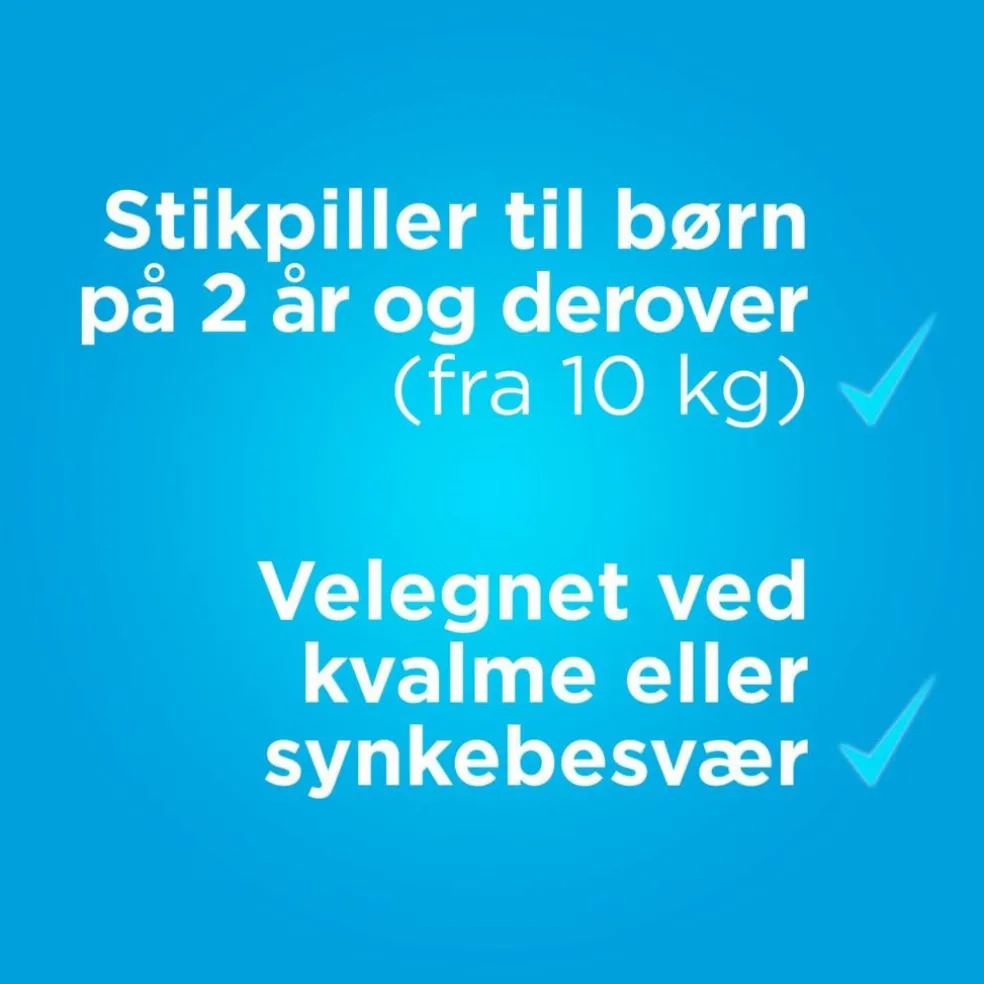20-29 kg: 2 suppositorier på 125 mg (i alt 250 mg) højst 4 gange i døgnet.