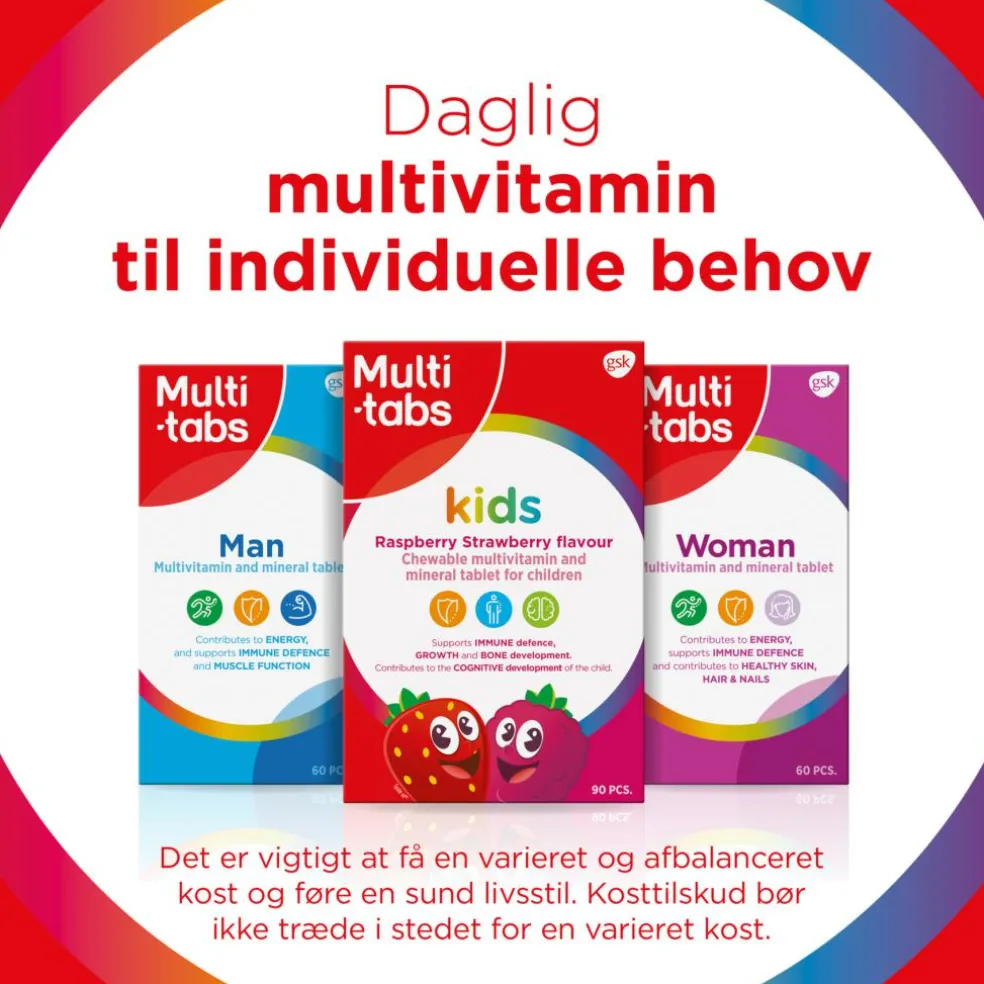 Multi-tabs Kids er en del af Multi-tabs børneserie. Serien indeholder desuden en tygbar multivitamin med calcium (kalk) og et velsmagende omega-3 fiskeolieprodukt.