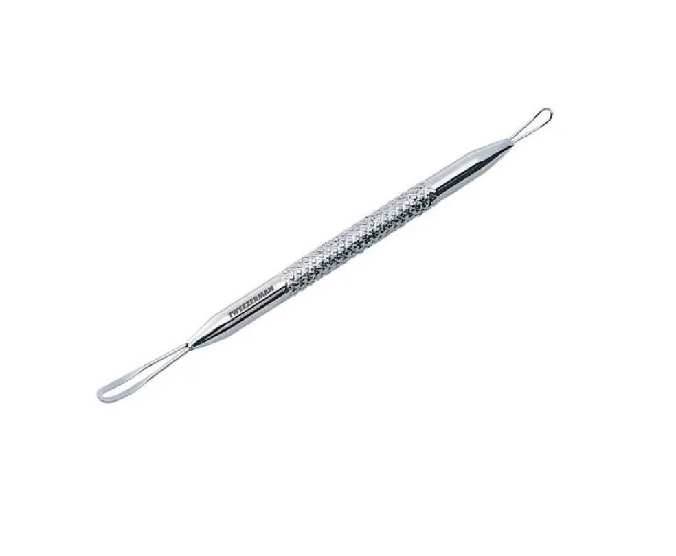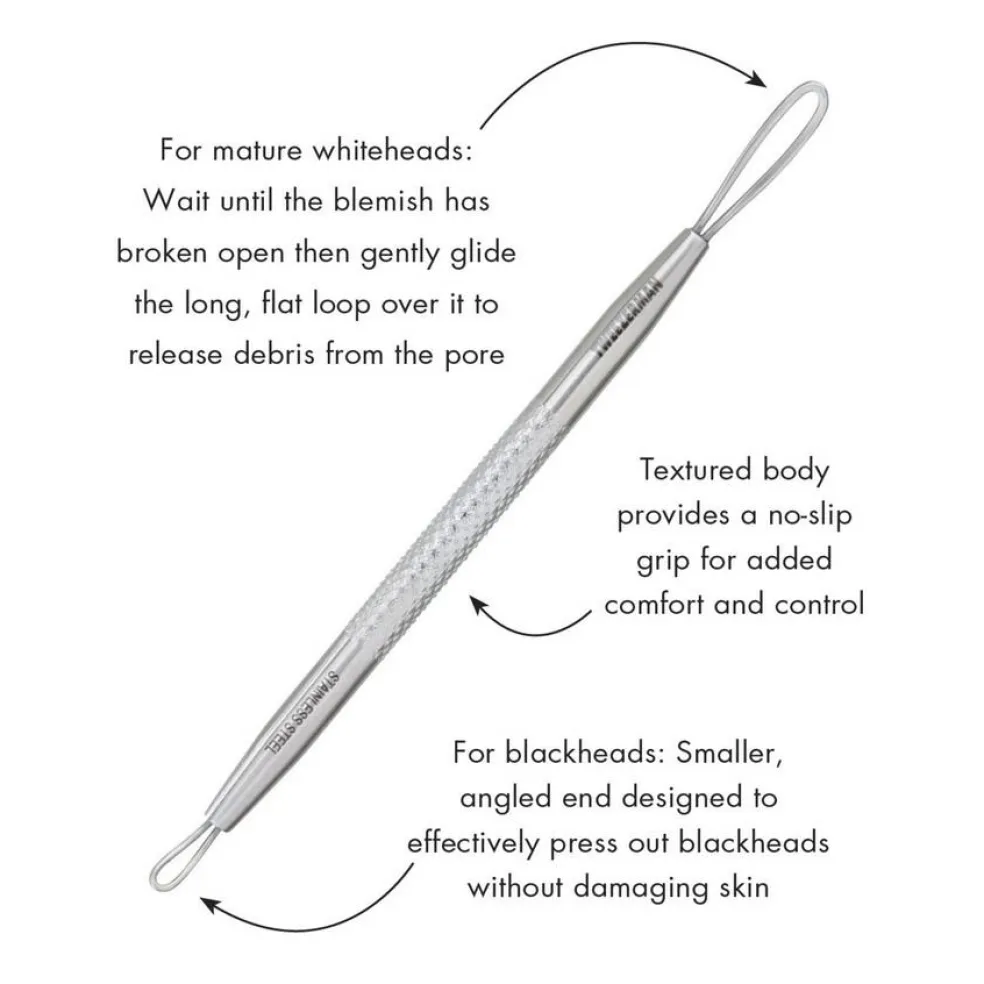 Fjern mørke og hvide hudorme sikkert og blidt med dette rustfri hudpleje værktøj med en løkke i hver ende. Et must til dig, der selv plejer en vanskelig hud. • Fjerner sorte og hvide hudorme sikkert og hygiejnisk i modsætning til fingrene, som kan forårsage infektion og ardannelse.• Lang flad løkke specielt designet til blidt og sikkert at presse hvide hudorme ud.• Mindre, vinklet løkke designet til effektivt at presse sorte hudorme ud uden at skade huden.• En speciel overflade sikrer et fast greb for ekstra komfort og kontrol. • Førsteklasses rustfri stål sikrer et holdbart værktøj som er let at rengøre.Anvendelse:Brug med stor forsigtighed. Sterilisér værktøjet før brug med sprit eller antibakteriel sæbe og varmt vand.1. Tag et varmt dampbad eller brug en varm vaskeklud til at åbne porerne. Anvend kun på vel renset hud.2. Med hensyn til hvide hudorme skal du vente indtil hudormen har åbnet sig og dernæst forsigtigt føre den lange flade løkke henover den for at fjerne det sidste fra poren.3. Brug modsatte endes mindre vinklede løkke til forsigtigt at presse den sorte hudorm ud uden at skade huden.4. Steriliser værktøjet efter brug med sprit eller antibakteriel sæbe og varmt vand.Pleje:Disinficer begge ender med isopropyl alkohol eller peroxid efter hver anvendelse. Værktøjet kan desinficeres i en autoklave eller med barbicid.
