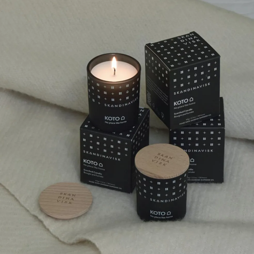 Små duftlys bestående af en voksblanding af svensk rapsolie. Lyset er vegansk og kommer i et malet glas med indgraveret FSC-certificeret bøgetræslåg.