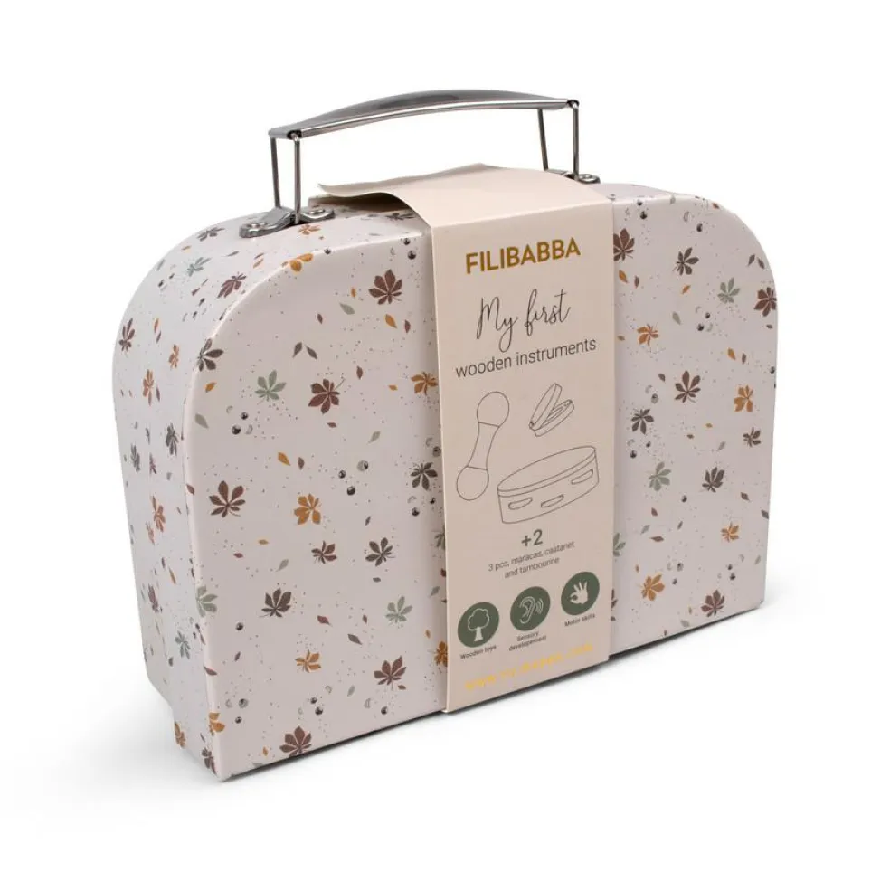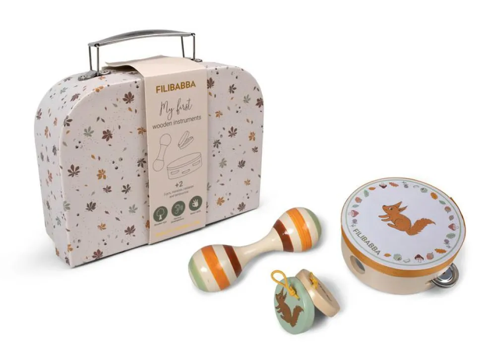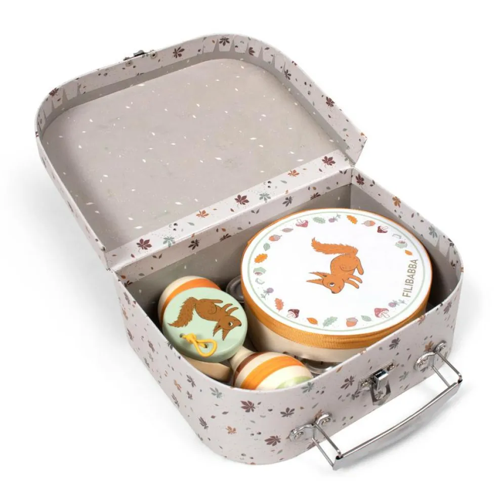 Kufferten indeholder tre instrumenter: Castagnet, maracas og tamburin. Instrumenterne er lavet lavet i poppel- og bøgetræ og udsmykket med de sødeste illustrationer af egern samt elementer fra naturen. Ydersiden af kufferten er udsmykket med det fine print Chestnuts med farverige kastanjeblade.