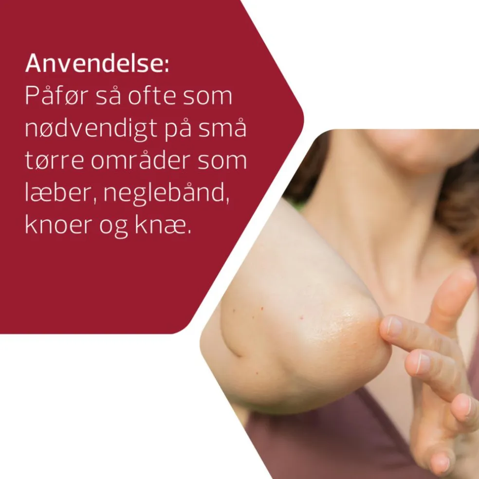 - Kan bruges på tørre og sprukne læber, flossede neglebånd, smårifter og små tørre pletter på huden.