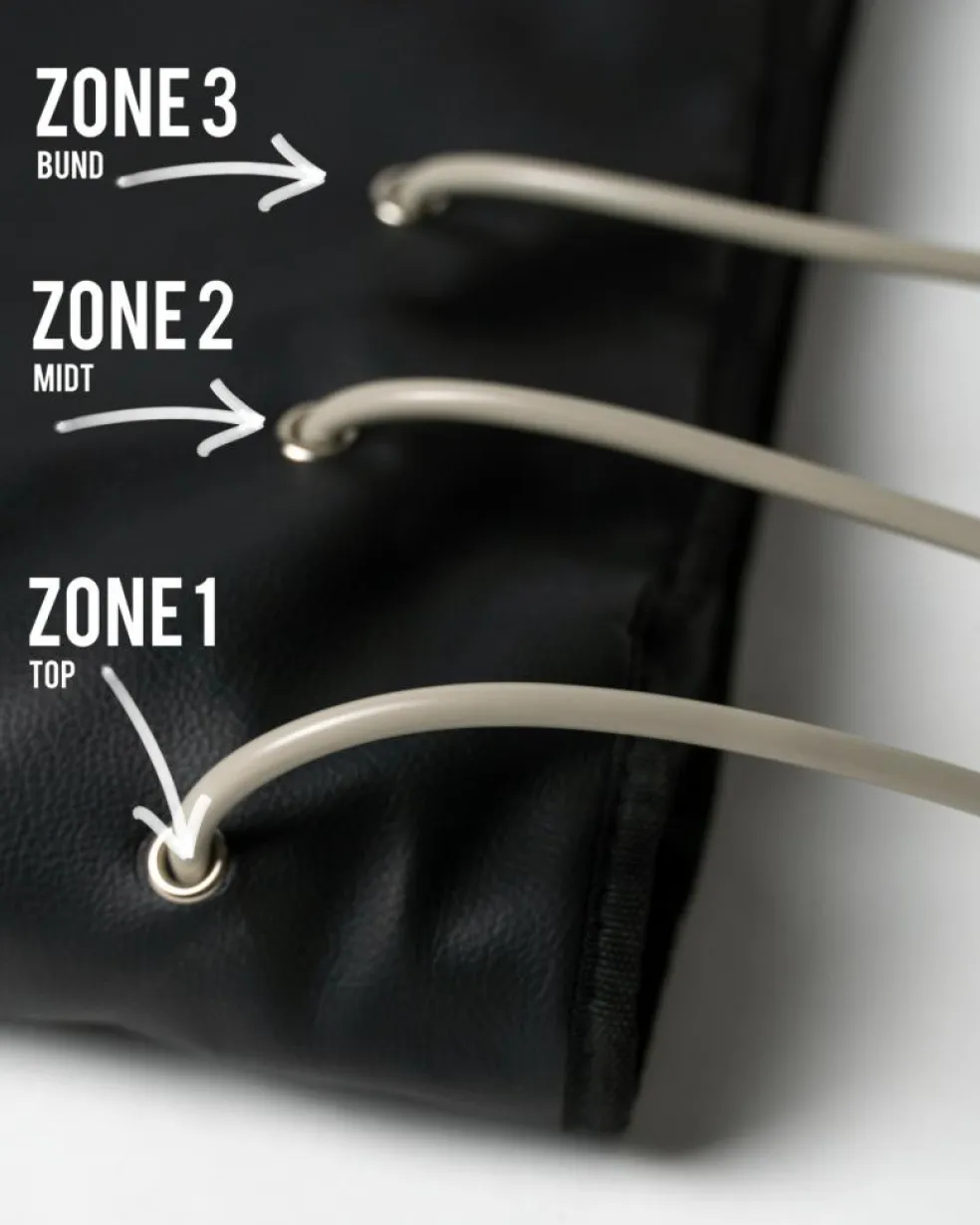 Model Luksus fra GoodFlow er inddelt i 3 zoner. Zone 1 er overkrop området, zone 2 er midt-krop området, og zone 3 er underben/fod område.
