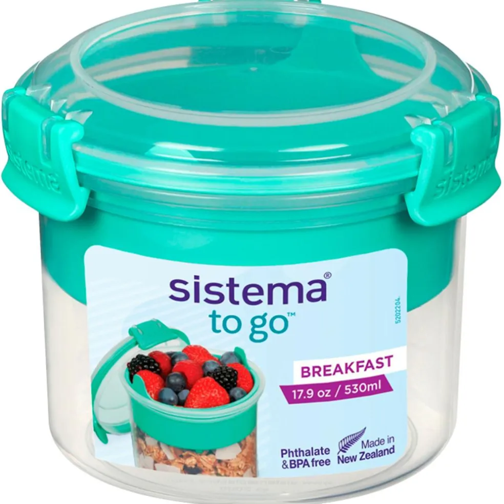 Beholder fra Sistema, der er perfekt til at have morgenmaden med på farten. Beholderen indeholder en bakke, så du eksempelvis kan adskille mysli fra yoghurten eller andet. Desuden medfølger en ske, der kan sættes fast i beholderen.