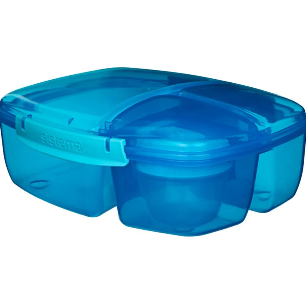 Madkasse fra Sistema, hvor der er plads til det hel. Madkassen er opdelt i 3 rum – 1 stort og 2 små, der tilsammen kan indeholde 2 liter. Desuden medfølger et yoghurtbæger på 150 ml.