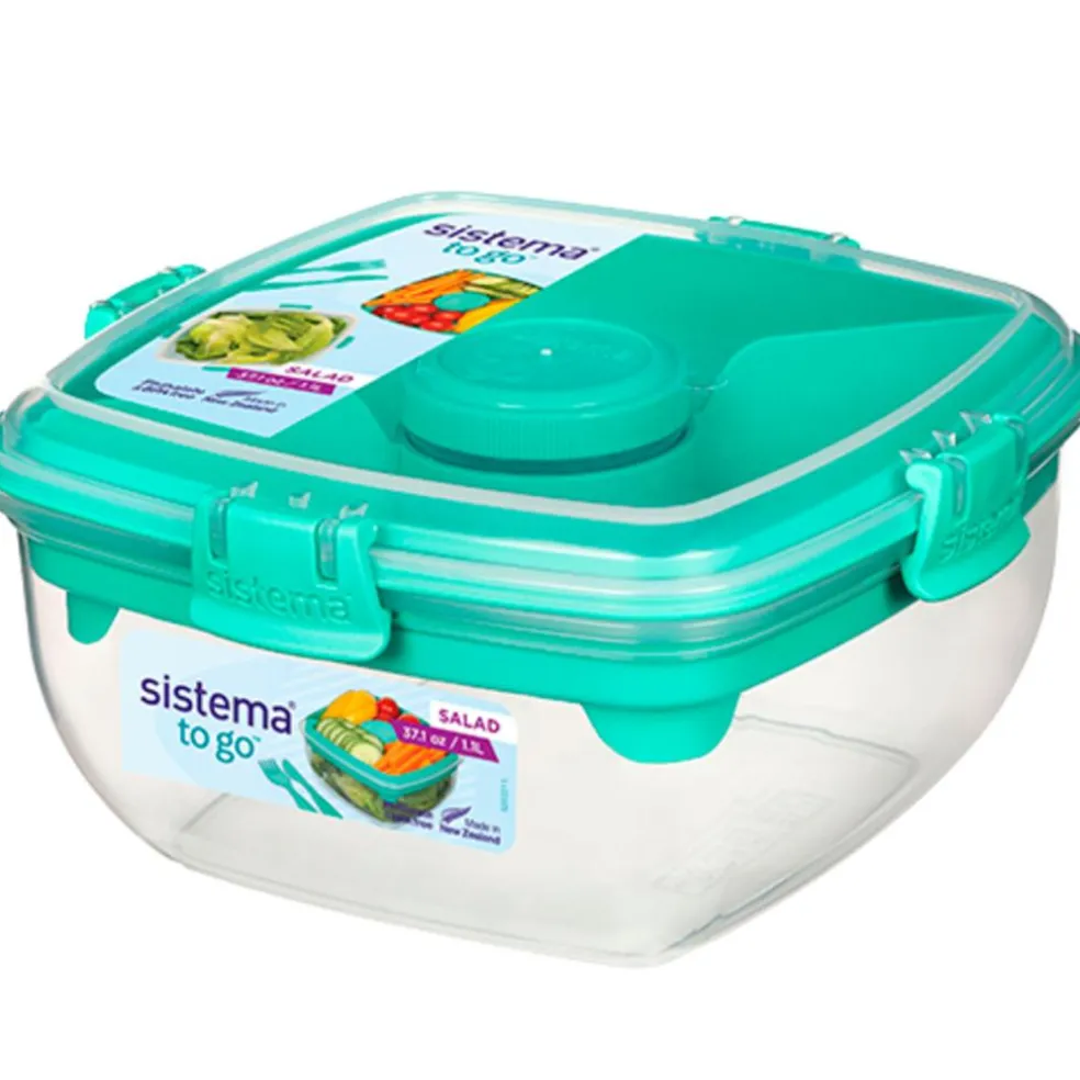 Smart salatboks til at tage med på farten inkl. kniv, gaffel og dressingbøtte, samt indlæg til opdeling af tilbehør.