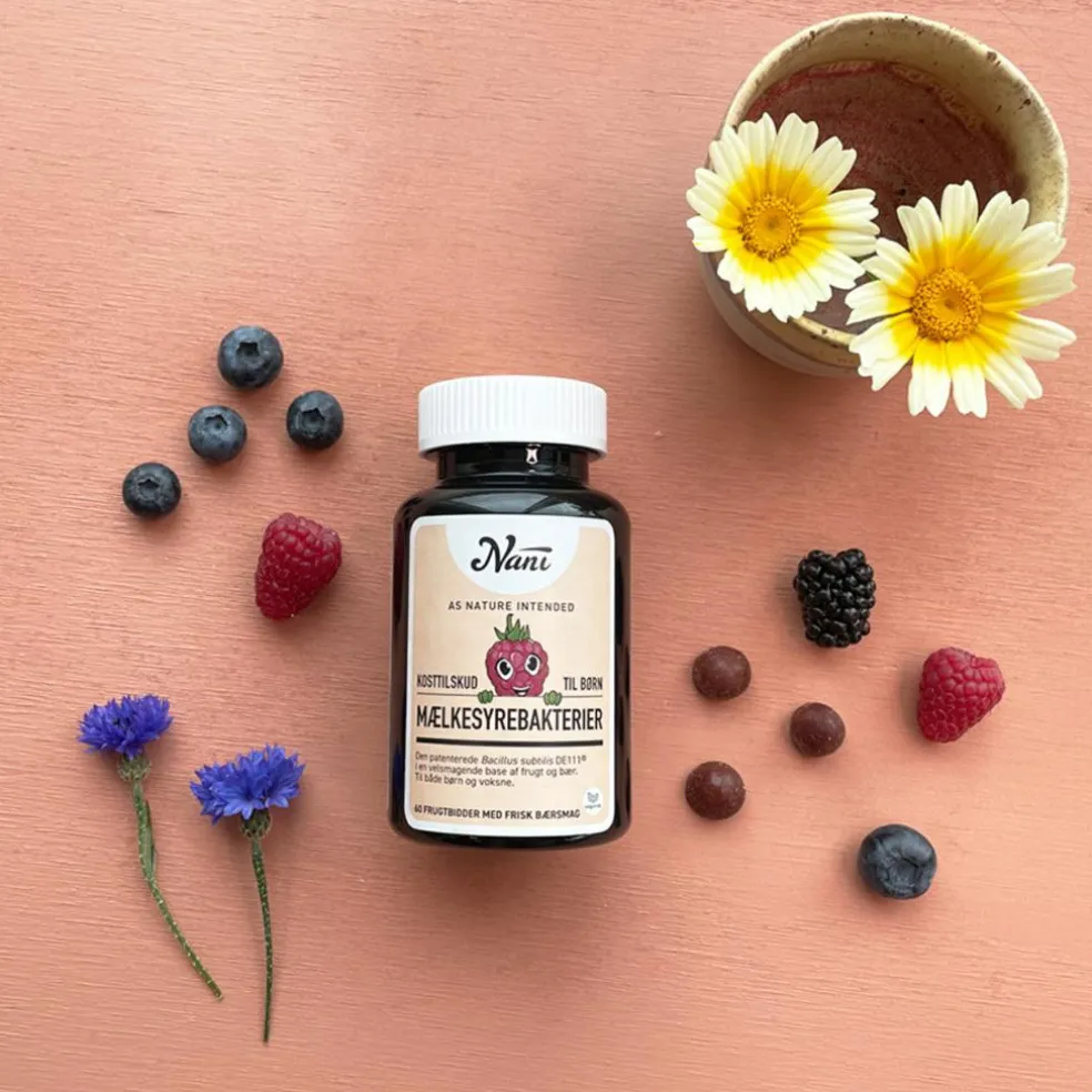 Produktet består udelukkende af naturlige ingredienser og er en lille frugt bid der indeholder hele 96,5% frugt og bær, med 1 mia. levende bakterier (den patenterede stamme Bacillus subtilis DE111®.)