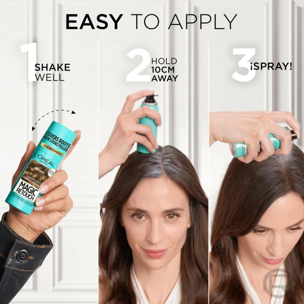 En hurtigtørrende spray, der er specielt udviklet til effektivt at skjule grå udgroning i brunt hår.