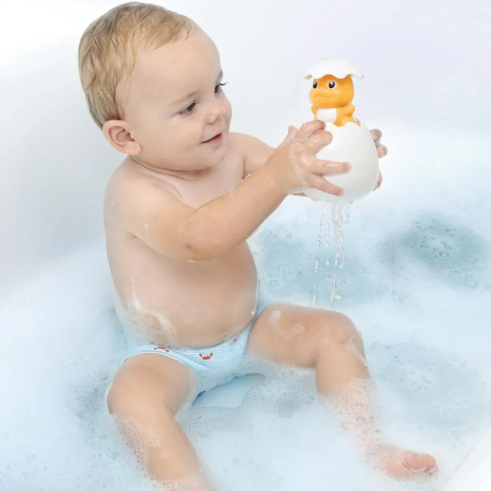 Dinoen stikker genert hovedet ud af skallen under vand og som en overraskelse for barnet regner det som et brusebad under ægget, når det kommer op af vandet.