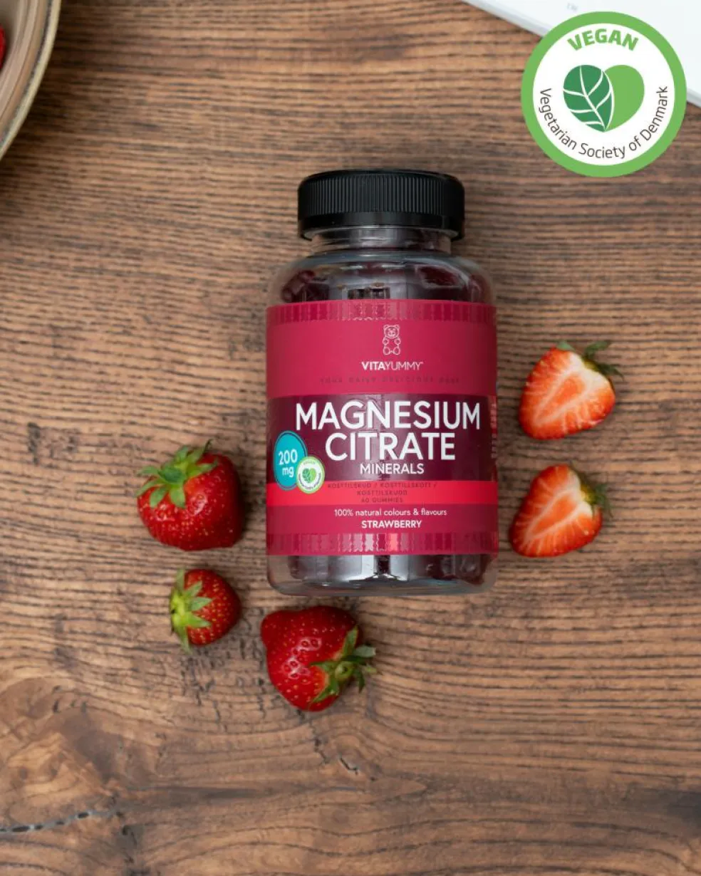 VitaYummy Magnesium Citrate indeholder 200 mg magnesium citrat og har en lækker strawberry smag. Magnesium citrat har en god optagelighed og stammer fra citronsyre, der findes naturligt i planter. Magnesium er et vigtigt mineral, der indgår i processer som blandt andet stofskifte og nervernes funktion og fungerer således i samspil med hundredvis af enzymer. Magnesium findes også i knoglerne, og det er med til at sikre, at kalk fastholdes i både knogler og tænder. Magnesium findes ligeledes i vores muskler og sørger for at hjælpe med at skabe balance af elektrolytter, som er vigtigt under fysisk aktivitet eller træning. Samtidig fungerer magnesium også som elektrolytter, som er meget vigtige for opretholdelse af kroppens væskebalance og fysiologiske funktioner. Elektrolytternes primære funktion er at kontrollere og bevare væskebalancen i og omkring cellerne.