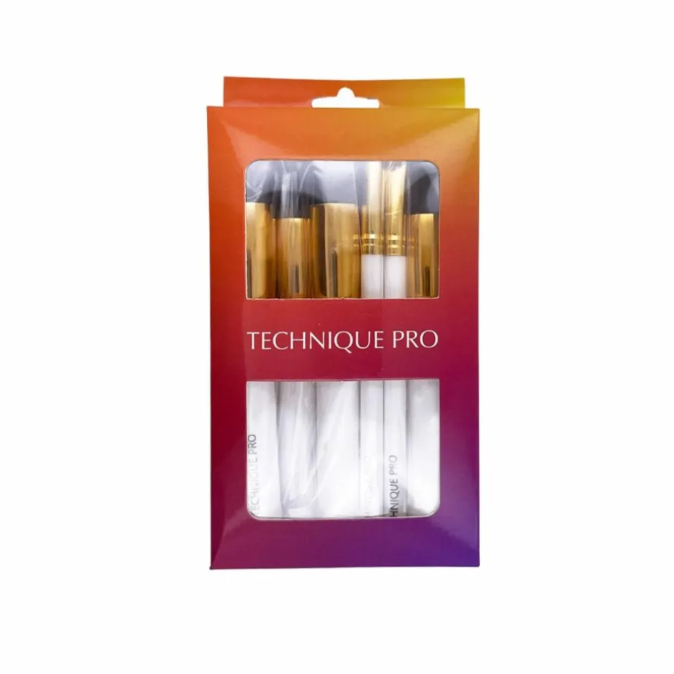 Technique Pro makeup børste sæt i guld indeholder 10 børster i alt – 5 præcisionsbørster og 5 kabuki børster. Børsterne består af tætpakket syntetisk hår i høj kvalitet. Akslen har et greb i mat hvid med guld finish.