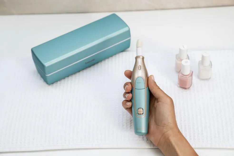 Du får både et praktisk opladnings- og opbevaringsetui med samt en beskyttelseshætte til neglestøv.