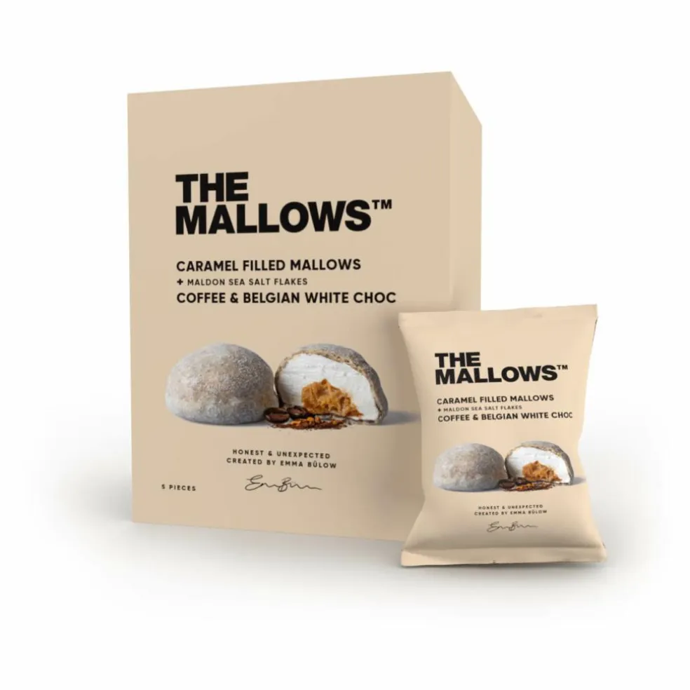 Coffee & White Choc er Karamelfyldte skumfiduser dragéret med belgisk hvid chokolade og karamel. Disse er mellem lagene af chokolade drysset med kaffe – en ekstraordinær oplevelse for enhver kaffeelsker!