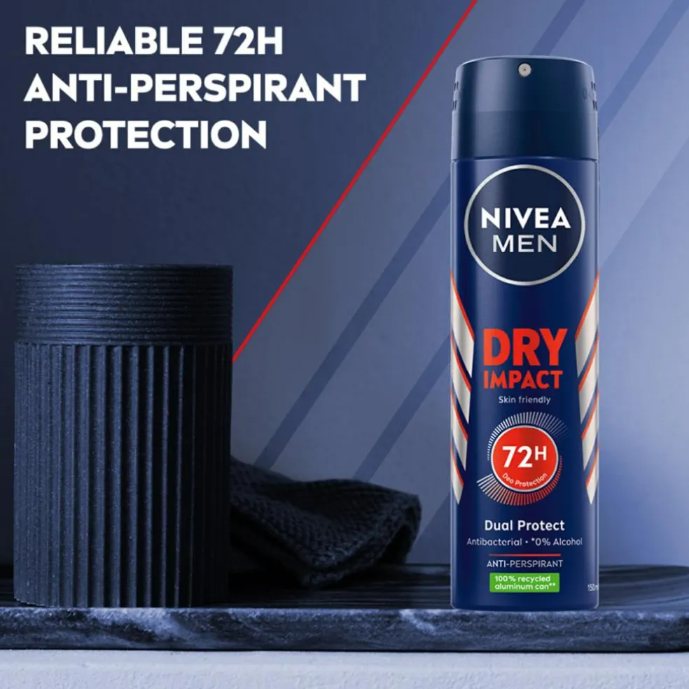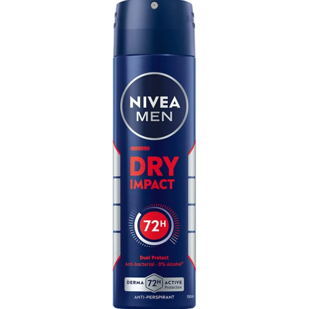 NIVEA MEN Dry Impact Anti-Perspirant er en spraydeodorant, der med sin nye formel giver 72 timers beskyttelse og garanterer en behagelig tør følelse. Den effektive dobbeltbeskyttelsesformel med to antibakterielle ingredienser hjælper dig med at holde dig tør fra sved og forhindrer dårlig lugt. Dry Impact Anti-perspirant deodoranten er skånsom mod huden og har en frisk duft med noter af citrus og urter. For en behagelig og tør følelse på huden. Denne spraydeodorant er velegnet til alle hudtyper og er dermatologisk testet. Nu kan du holde dig tør og frisk hele dagen!