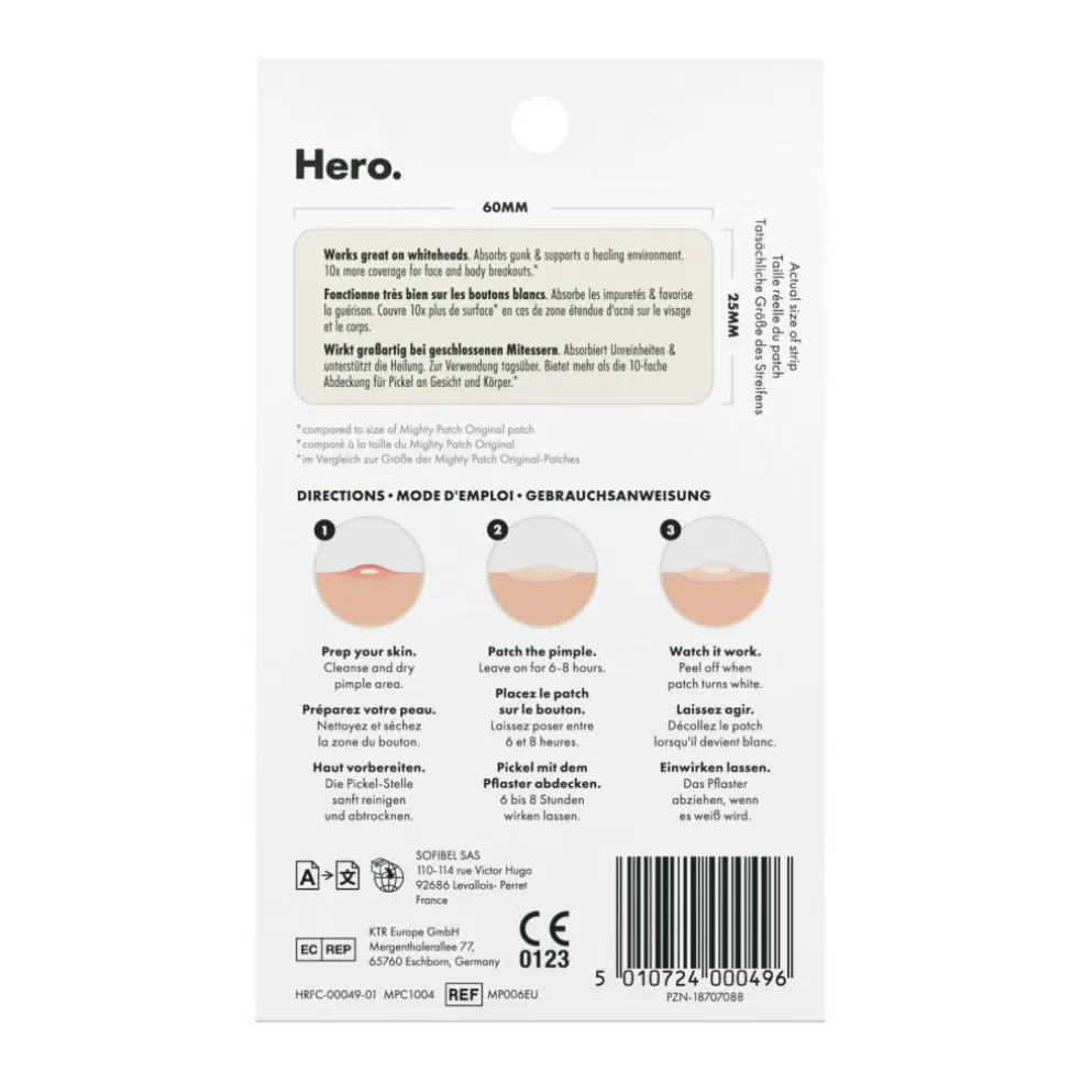 Når et almindeligt bumseplaster ikke er nok, kommer Hero Cosmetics Mighty Patch Surface til undsætning. Dette ekstra store hydrocolloid-akneplaster er udviklet til at dække større udbrud og hjælpe med at reducere synligheden af bumseområder på bare få timer. Plastrets store størrelse gør det ideelt ikke kun til ansigtet, men også til uren hud på kroppen – som fx bryst, ryg og skuldre.