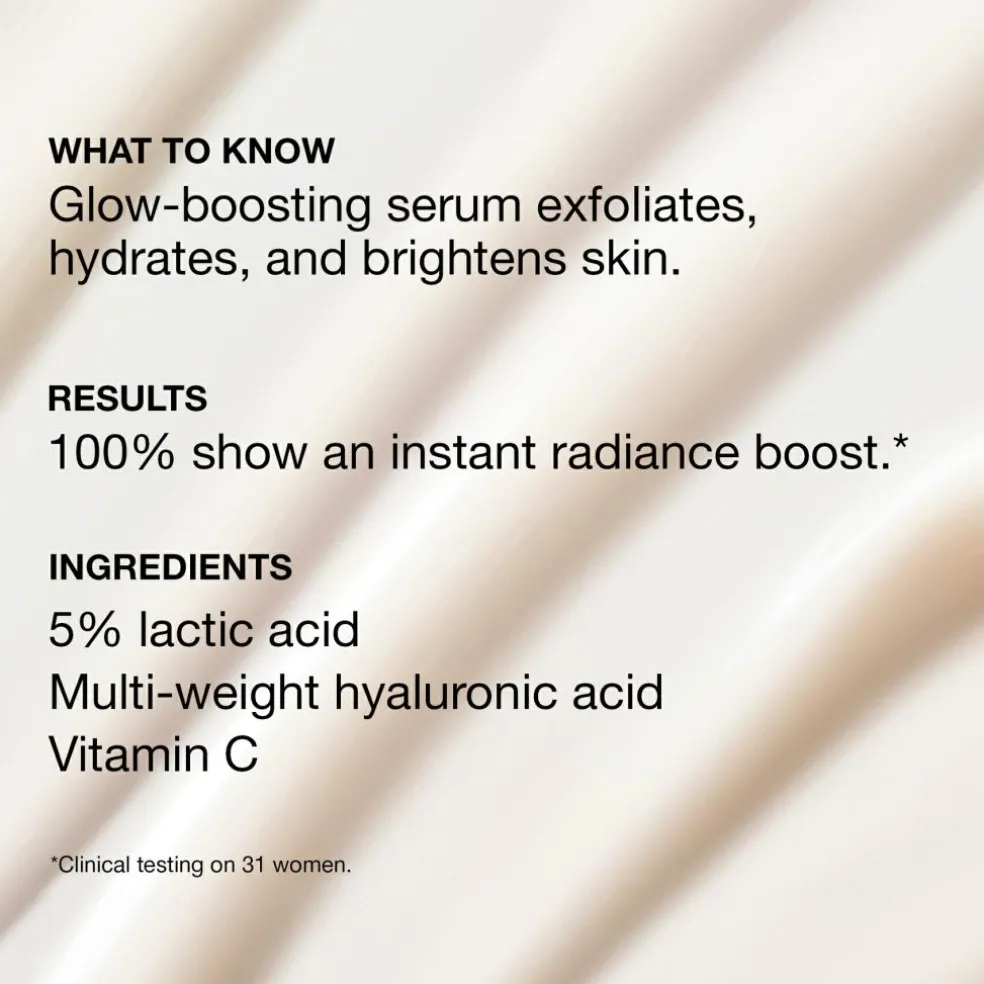 Moisture Surge Active Glow Serum fra Clinique er et let eksfolierende serum med 5% mælkesyre, hyaluronsyre og C-vitamin, som hjælper med at eksfoliere, fugte og lysne huden. Dette serum eksfolierer mildt og fjerne døde hudceller, mens den fugter huden i dybden og lysner hudtonen for et look med mere glød.