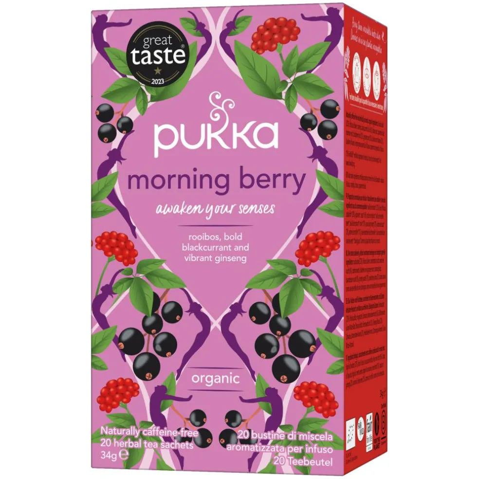 Pukka Morning Berry te er, som alle andre Pukka teer, økologisk og helt fri for kunstige smagsstoffer. Naturligt fri for koffein.